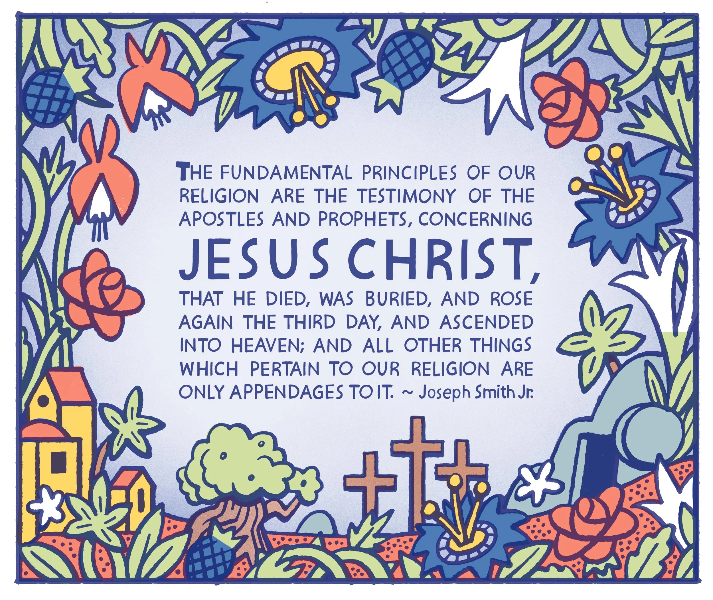 I created a series depicting central moments in the life of Jesus Christ that (I hope) feel more accessible to both those familiar and not-so-familiar with Christianity. I looked to Eastern European folk art and the work of Czech painter Josef Lada (1887-1957) for inspiration. The meanings Christians have historically attached to flowers intrigue me and make the work feel more rooted in tradition. Among these are the mourning columbine, the exquisite passion flower, the thorny red rose, and the triumphant Easter lily. This quote by Joseph Smith Jr. (founder of the Church of Jesus Christ of Latter-day Saints) fitly describes the importance of this series.
